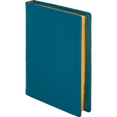 Ежедневник А5 датированный на 2025 год, цвет бирюза 143×205 мм, ляссе золотого цвета, 352 страницы, тонированный блок с печатью в 2 краски, обрез блока окрашен в золотой цвет, имеется бумажный конверт на заднем форзаце ежедневника, календарь на 2025-2028 гг. Обложка выполнена из натуральной высококачественной кожи Флоттер с тиснением «гусиная лапка», с поролоном. Блок: офсет 80 г/м2 (линейка). Содержит информационно-справочный блок — праздники России, международные коды городов России, цифровые коды ГИБДД, справочник неметрических единиц и перевод в метрические, размеры одежды. Вставка — алфавитный блок без вырубки. Нет петли под ручку. Поставляется упакованным в полипропиленовом пакете.