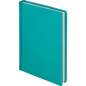 Ежедневник А5 датированный на 2025 год, цвет бирюзовый 143×205 мм, ляссе белого цвета, 136 листов, белый блок с печатью в 2 краски, календарь на 2025-2028 гг. Обложка выполнена из искусственной кожи с покрытием «Soft touch», на корешке выполнено тиснение «гусиная лапка», с поролоном. Блок: офсет 80 г/м2 (линейка). Содержит информационно-справочный блок — праздники России, международные коды городов России, цифровые коды ГИБДД, справочник неметрических единиц и перевод в метрические, размеры одежды. Вставка — алфавитный блок без вырубки. Нет петли под ручку. Поставляется упакованным в полипропиленовом пакете.