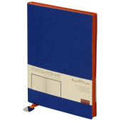 Ежедневник недатированный Bruno Visconti Mercury. Формата A5, размер изделия — 148×212 мм. Обложка синего цвета выполнена из искусственной кожи с оранжевым обрезом. Блок: недатированный, 136 листов (272 страницы) высококачественной белой бумаги (плотность 70-90 г/кв.м.) в линейку, печать в 2 цвета. Двойная оранжевая закладка-ляссе с шильдом. Содержит информационно-справочный блок — международные коды городов мира, европейские аэропорты, цифровые коды ГИБДД, среднемесячная температура, телефоны первой необходимости, штриховой код, неметрические единицы, междугородные коды России и мира, денежные единицы, размеры одежды. Подходит для любого вида тиснения.