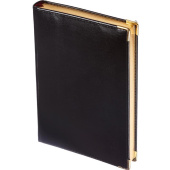 Формат А5, размер изделия — 145×216 мм. Выполнен в строгом классическом стиле. Обложка из натуральной полуматовой кожи тонкой фактуры. По периметру проходит отделочная строчка. Уголки закругленной формы сделаны из металла. Блок: полудатированный, из бежевой офсетной бумаги высокой плотности, 70-90 г/кв.м., 208 листов (416 страниц) с золотистым обрезом. Для удобства использования предусмотрено два ляссе. Первые 19 страниц отведены под справочные сведения, на последних 28 страницах представлена телефонная книга. Две закладки-ляссе бордового цвета помогут быстро ориентироваться в записях. Ежедневник в индивидуальной упаковке.