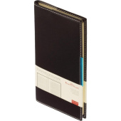 Еженедельник недатированный с металлическим шильдиком. Обложка черного цвета из высококачественного переплетного материала имеет гибкую, но невероятно прочную фактуру, подходящую, в том числе для тиснения. Эффектная отстрочка белыми нитками по контуру и металлический декор являются оригинальными деталями отделки. Недатированный еженедельник компактного формата А6 состоит из 160 страниц, объединенных в сменный блок. Бумага бежевого цвета обладает высшим качеством и плотностью 70-90 г/кв.м. Информационно-справочный блок, размещенный на 18 страницах является источником полезной информации, которая пригодится при ведении бизнеса.