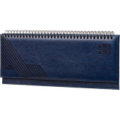 Планинг датированный 2026 год Escalada искусственная кожа 310×130 мм 64 листа синий (синий обрез) Обложка: твёрдый переплёт с поролоном, блинтовое тиснение, обстрочка по периметру — есть, прямые углы обложки. Внутренний блок: евроспираль открытая, белый офсет 70 г/кв.м, печать в две краски (линия), прямые углы блока, перфорация углов блока — нет, справочный материал — есть. Красочность форзаца: печать пантоном. Индивидуальная упаковка: ПЭТ-пакет.
