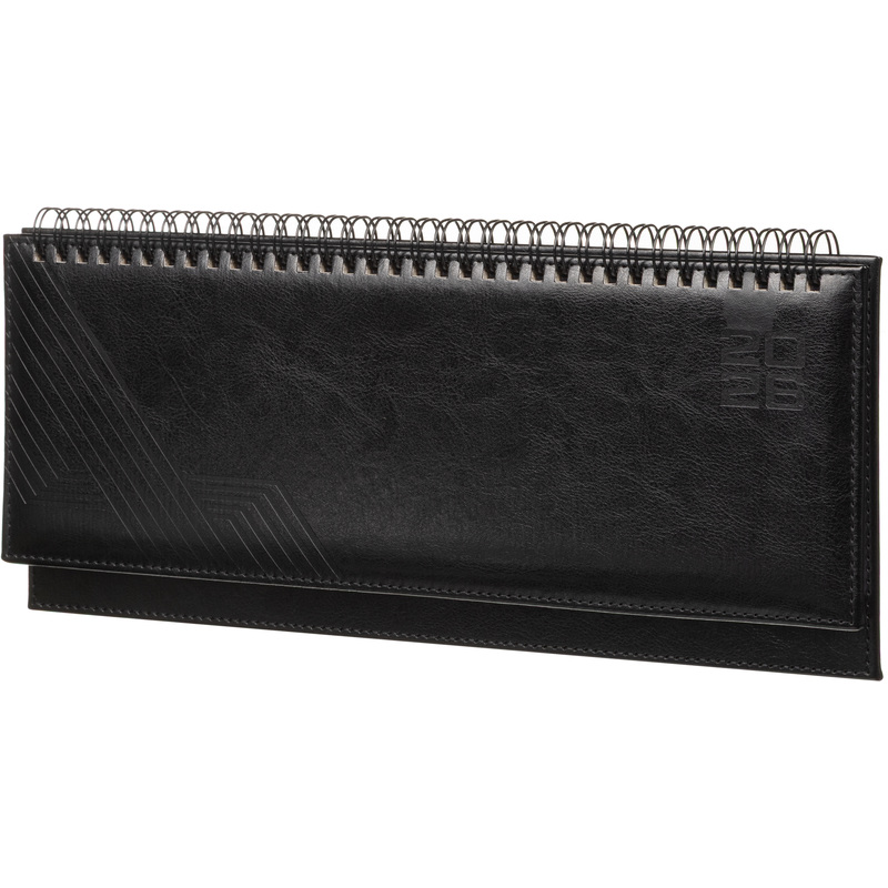 Планинг датированный 2026 год Escalada искусственная кожа 310×130 мм 64 листа черный (чёрный обрез) Обложка: твёрдый переплёт с поролоном, блинтовое тиснение, обстрочка по периметру — есть, прямые углы обложки. Внутренний блок: евроспираль открытая, белый офсет 70 г/кв.м, печать в две краски (линия), прямые углы блока, перфорация углов блока — нет, справочный материал — есть. Красочность форзаца: печать пантоном. Индивидуальная упаковка: ПЭТ-пакет.