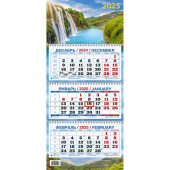 Настенный квартальный трехблочный календарь на 2025 год с курсором, формат в разложенном виде 195×465 мм, в индивидуальной упаковке (европакет с подвесом). Состоит из красочного постера на мелованном картоне плотностью 250 г/кв.м, покрытого глянцевым
