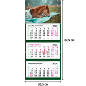 Календарь настенный 3-х блочный 2026 Жеребёнок 30.5×67.5 см Настенный трёхблочный отрывной календарь. Общий размер календаря — 305×675 мм. Шпигель — форматом 305×195 мм изготовлен из мелованного целлюлозного картона. Блок — форматом 290×140 мм, изготовлен из офсетной бумаги 80 г, печать в 2 цвета. Крепление: каждая секция на металлическом гребне, с бегунком и люверсом, индивидуальная упаковка.