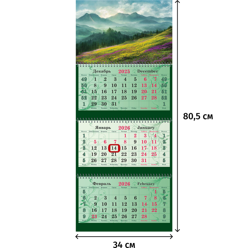 Календарь настенный 3-х блочный 2026 Альпийский луг 34×80.5 см Настенный трёхблочный отрывной календарь с магнитным курсором. Общий размер календаря — 340×805 мм, шпигель — формат 340×220 мм, целлюлозный мелованный картон 300 г/кв.м, 4+0, УФ-лак. Блок — мелованная бумага 100 г, формат 320×165 мм, печать в 4 краски, крепление: каждая секция на металлическом гребне, с бегунком и люверсом, индивидуальная упаковка, магнитный курсор.