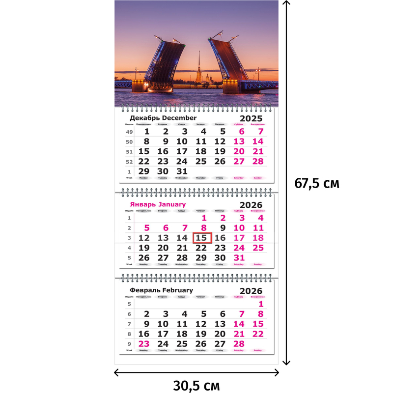 Календарь настенный 3-х блочный 2026 Мосты на Неве 30.5x67.5 см