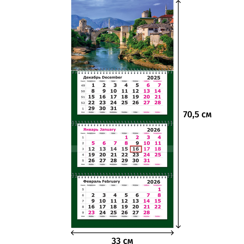 Календарь настенный 3-х блочный 2026 Москва 30.5x78 см