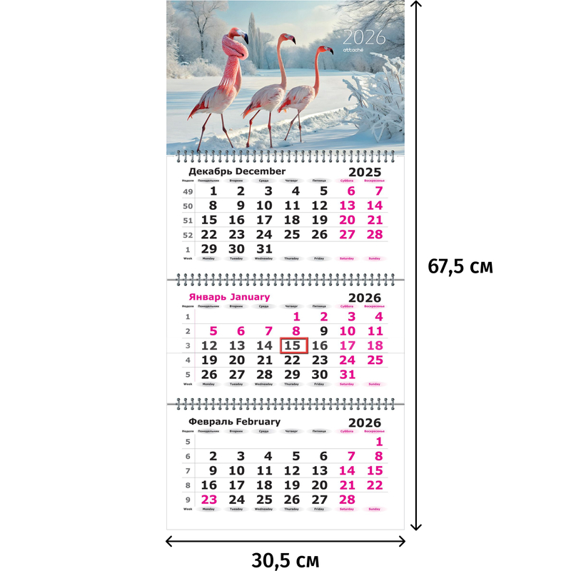 Календарь настенный 3-х блочный 2026 Розовый фламинго 30.5x67.5 см