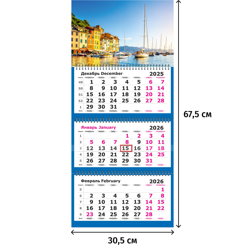 Календарь настенный 3-х блочный 2026 Яхты на море 30.5x67.5 см