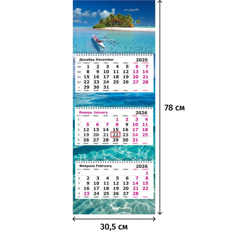 Календарь настенный 3-х блочный 2026 Пляж 30.5x78 см