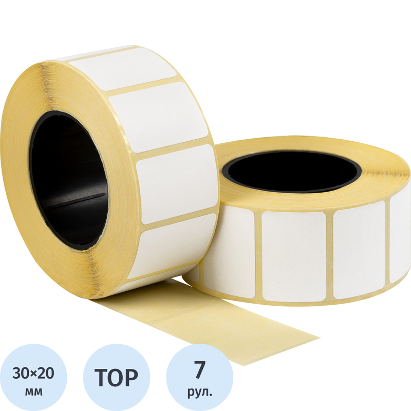 Термоэтикетки 30х20 мм ТОП 40 мм диаметр втулки (7 рулонов по 1000 этикеток)