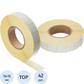 Термоэтикетка размером 15×15 мм без печати белого цвета изготовлена из материала Thermal Top (Топ) ведущих производителей. Рулон с втулкой диаметром 40 мм содержит 2000 плюс-минус 5 этикеток. Самоклеящиеся термоэтикетки применяются для нанесения веса, штрихкодов, цен и другой информации, маркировки товаров недлительного хранения. Потенциальные потребители — супермаркеты, производство, центры техобслуживания кассовых аппаратов, снабжающие компании, компании по поставке упаковочных материалов, предприятия, занимающиеся фасовкой продукции и т.д. Термоэтикетки предназначены для печати на термопринтерах в режиме прямой термопечати (Direct Termal, печать с помощью термоголовки).