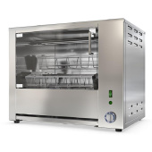 — Угол и положение открытой двери не препятствует выемке садка с курами. Гриль для кур, карусельного типа, расчитан на 8 кур, имеет 4 садка. Время приготовления при полной загрузке 60–70 минут. Все элементы гриля, контактирующие с пищевыми продуктами, выполнены из нерж. стали. Стеклянная дверь позволяет визуально наблюдать за приготовлением.
