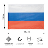 Флаг Российской Федерации уличный. Материал флажная сетка (мультифлаг), плотность 118 г/кв.м. Крепление: по левой стороне карман в сложенном виде 5.5 см (под древко максимальным диаметром 3 см), в левых углах по петле с карабином. По периметру обшивка двойной строчкой. Размеры 150×225 см.