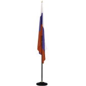 Напольный флаг России с металлическим флагштоком черного цвета. Полотно изготовлено из износостойкой синтетической ткани. В случае загрязнения флаг можно стирать при температуре 30 градусов. Размеры флага (ШхГхВ) 390×390×2300 мм. Поставляется в разобранном виде.