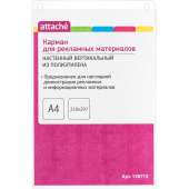 Карман вертикальный настенный Attache предназначен для размещения информации. Для изготовления использован прозрачный полиэтилен. Карман имеет одно отделение для размещения листов формата А4. На стене размещается в вертикальном положении. Запаян карман только снизу. Поставляется в защитной пленке. Крепежные отверстия высотой 12 мм — каплеобразные, диаметр нижней части — 8 мм. Толщина кармана — 0.7 мм. Поставляется упаковками по 10 штук.