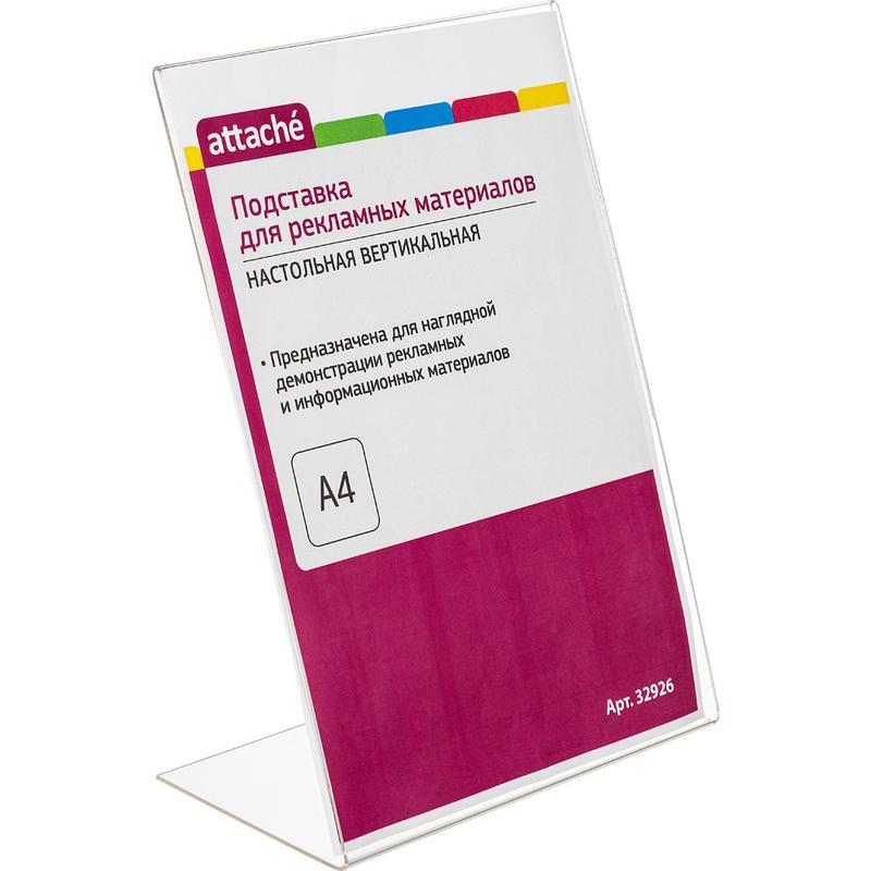 Вертикальная односторонняя настольная подставка Attache для рекламных материалов. Формат А4. Изготовлена из прозрачного акрилового оргстекла. Поставляется в защитной пленке. Размеры (ВxШxГ): 297×210×100 мм.