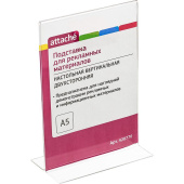 Торговая марка Attache Цвет прозрачный Страна происхождения Россия Материал акрил Формат А5 Назначение для рекламных материалов Единица продажи штука Размер, мм 210x148x70 Количество штук в упаковке 1 Количество отделений 1 Двухсторонняя Да Вид изделия подставка Расположение вертикальное Установка настольная -