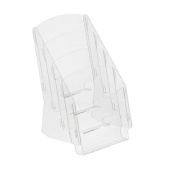 Вертикальная односторонняя настольная подставка со смещением предназначена для размещения буклетов и прочих информационных материалов в местах продаж, офисах, учреждениях. Изготовлена из прозрачного акрилового стекла. Имеет 4 отделения формата 1/3 А4. Внутренние размеры отделения: 115×23 мм. Размеры подставки (ВxШxГ): 225×118×160 мм. Вес: 30 г.