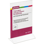 Вертикальная двухсторонняя настольная подставка Attache изготовлена из прозрачного акрила, имеет устойчивое основание. Позволяет размещать постеры и другие демонстрационные материалы формата А5. Поставляется в защитной пленке, по 10 штук в упаковке. Подставка основа — съемная. Размеры изделия (ВxШxГ): 210×148×75 мм.