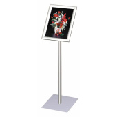 Разборный информационный напольный стенд предназначен для хранения печатной продукции формата А4 в вертикальном положении и под углом 45 градусов. Основание — окрашенная металлическая пластина размером 28×28 см и толщиной 5 мм, стойка — алюминиевый анодированный профиль, постер вставляется в алюминиевую рамку с защелкивающимся профилем шириной 30 мм. Устойчивая конструкция размещается автономно без крепления к стенам и полу. Крепежные элементы для сборки и инструкция по сборке входят в комплект. Стойка не поворотная. Цвет серебристый. Вес стенда составляет 6.8 кг. Размеры рамки — 25×33 см, высота стойки — 100 см.