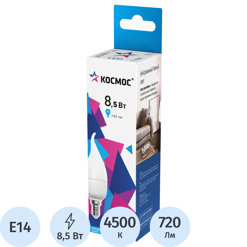 Лампа светодиодная Космос свеча 8.5Вт E14 4500K 720Лм 220В (10 штук в упаковке, LED8.5wCWE1445_10)