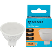 Светодиодная рефлекторная лампа Topfort, со штырьковым цоколем типа GU5.3, мощность 6 Вт. Является аналогом лампы накаливания в 50 Ватт. Матированное покрытие колбы позволяет рассеивать свет максимально приятно для восприятия глазом человека.
