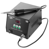 Мегеон 00303 — новинка в модельном ряду настольных паяльников. Цифровые регулировки и индикация облегчают проведение процессов пайки и лужения. Индукционный нагрев является отличительной особенностью представленного прибора. Микроконтроллерное управление совместно с термодатчиком максимально упрощают эксплуатацию данной модели и увеличивает срок службы нагревательного элемента. Быстрый разогрев и стабильная температура с разрешением до 1С делают работу с бессвинцовыми припоями предельно простой и безопасной. Распространенный типоразмер жала QSS200 — T, что дает возможность использования до 18 видов различных наконечников для выполнения требуемых задач. Немаловажным преимуществом при проведении паяльного процесса является маленький вес и мягкий провод. Изделие по достоинству смогут оценить профессионалы и радиолюбители.