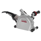 Интерскол представляет профессиональный штроборез, выполненный на базе углошлифовальной машины с модифицированным редуктором. Конструкция позволяет легко и быстро выполнять штробы, ролики на кожухе позволяют вести машину по поверхности ровно и уверенно. Ширина штробы регулируется дистанционными шайбами, а глубина — узлом регулировки вылета. Штроборез — инструмент для проделывания штроб (борозд) в каменной, кирпичной, бетонной поверхностях для прокладки инженерных коммуникаций. Оснащается двумя алмазными дисками. В частном случае возможно использование штробореза с одним диском для резки твердых материалов в качестве угловой алмазной пилы. Машина имеет регулятор погружения, благодаря которому можно получить штробу необходимой глубины. Изменение глубины штробы производится без дополнительных инструментов. Любая резка твердых материалов вызывает повышенное пылеобразование, поэтому штроборезы оснащаются эффективными системами пылеотвода и обязательно используются со строительными пылесосами. Узел пылеудаления использует кинетическую энергию частиц для направления их в патрубок пылеотвода. Диаметр пылеотвода стандартизован по системе 35.