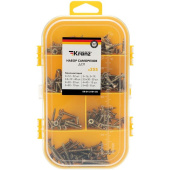 Набор саморезов по металлу и дереву Kranz (255 штук, KR-01-3101-05) Набор саморезов используется для крепления тонколистового металла, древесно-стружечных и гипсокартонных плит, брусьев, досок, полимерных ламелей к деревянным основаниям без предварительного сверления. В комплексе с пластиковым дюбелем универсальные саморезы (PZ) DIN 7962 могут использоваться для крепления к бетону, кирпичу, шлакоблоку. Саморезы изготовлены из стали, покрытой желтым цинком, что обеспечивает изделиям высокую прочность и долговечность. Стандартный набор состоит из 255 саморезов для ДСП, которых хватит для выполнения множества задач. Поставляется в пластиковом органайзере, который помогает не только удобно хранить изделия, но и быстро находить крепеж нужного размера. Органайзер может в дальнейшем использоваться для хранения других крепежных элементов. Набор состоит из саморезов: — 3,0×12 (52 шт.); — 3,0×16 (40 шт.); — 3,0×19 (40 шт.); — 3,5×19 (40 шт.); — 3,5×30 (30 шт.); — 4,0×30 (20 шт.); — 4,0×40 (15 шт.); — 5,0×50 (10 шт.); — 5,0×60 (8 шт.). Внешний вид и/или характеристики товара могут быть изменены производителем в соответствии с производственным процессом.