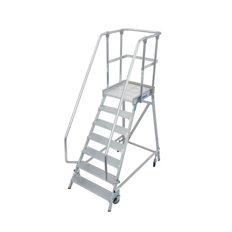 Односторонняя передвижная алюминиевая лестница с платформой. Широкие ступени, трехстороннее ограждение и большая платформа для удобства и безопасности при работе.