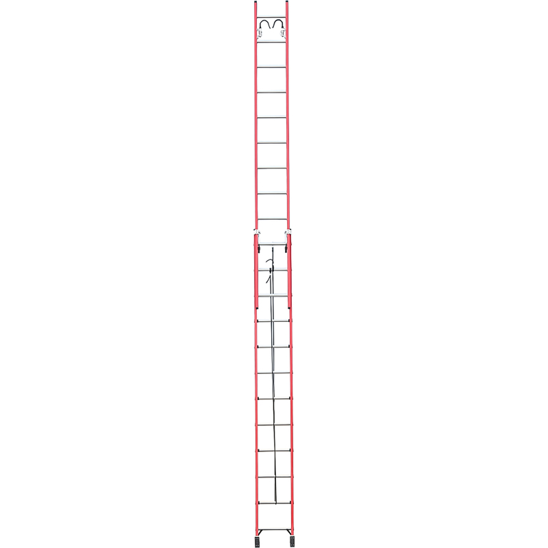 Лестница стеклопластиковая двухсекционная приставная с канатной тягой и крюками серии FGS предназначена для проведения различных видов работ на высоте до 7,5 м.