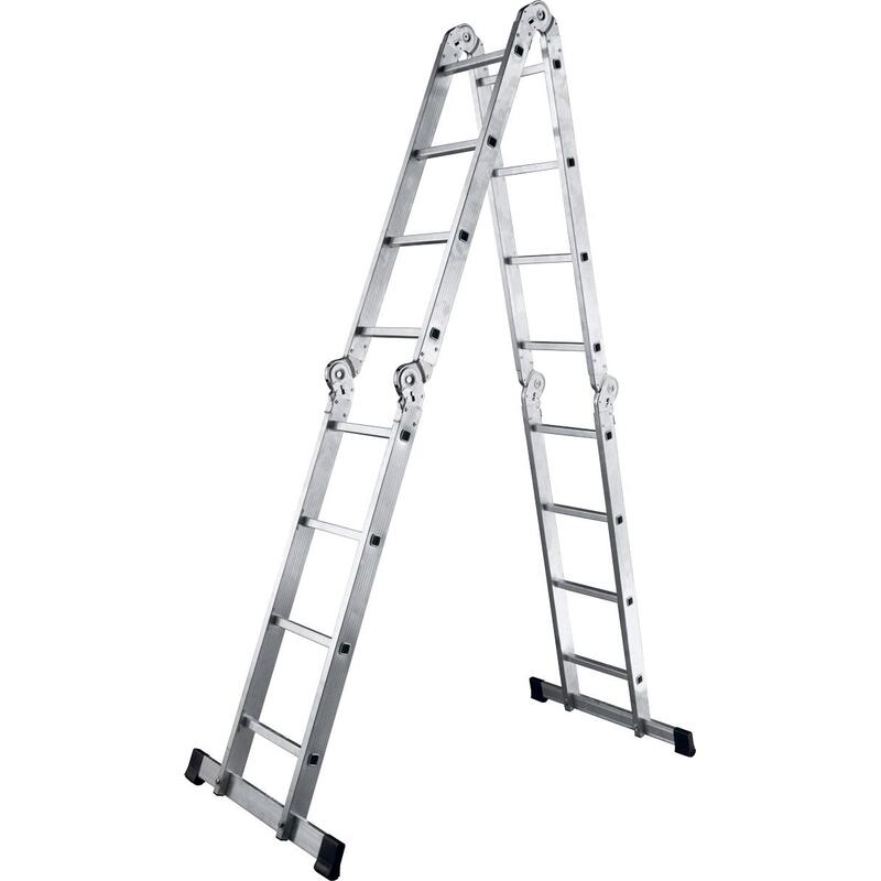 Лестница ТL4044 состоит из четырех секций, соединенных между собой стальными лестничными шарнирами с углами фиксации 35, 105 и 180 градусов. Поэтому такая лестница может принимать различные формы, такие как на рисунке.
