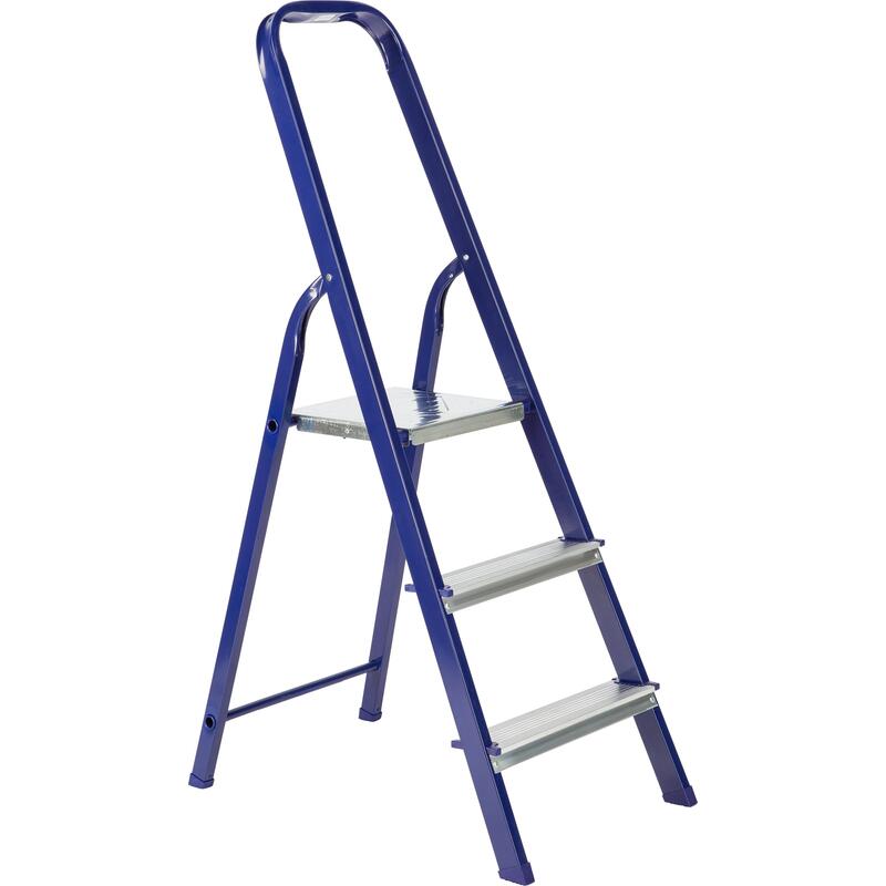 Стремянка стальная/алюминиевая 3 ступени TOPFORT. Стремянка представляет собой свободностоящую переносную лестницу, сужающуюся к верху, имеющую сторону подъема (переднюю ногу), опорную сторону (заднюю ногу), рабочую площадку и раскладывающуюся для выполнения определенной задачи. Дуга безопасности конструктивно выполнена совместно со стороной подъема.