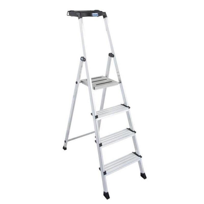 Стремянка алюминиевая 4 ступени Krause 126528. Практичная и универсальная стремянка с большой и удобной полкой, держателем ведра и нескользящей площадкой.