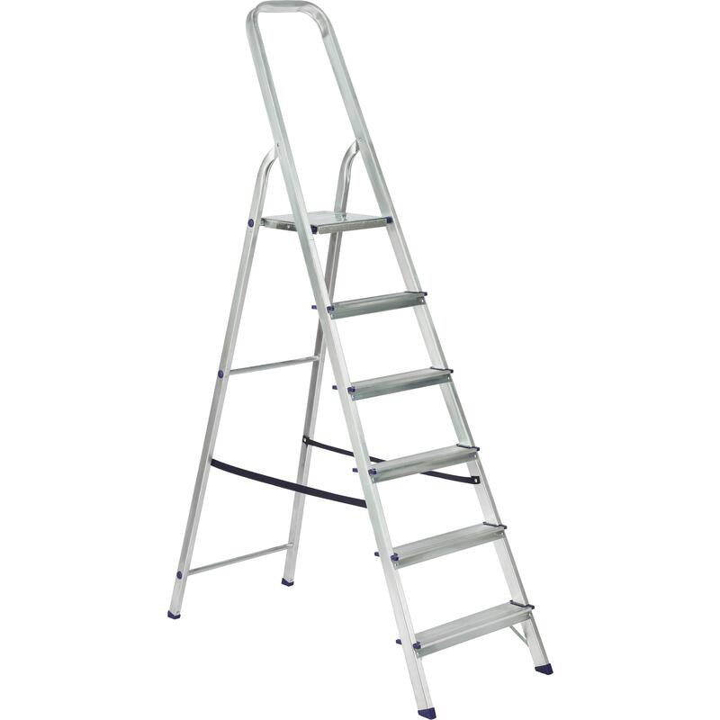 Стремянка алюминиевая 6 ступеней TOPFORT изготовлена из высокопрочного алюминиевого профиля. Дуга безопасности конструктивно выполнена совместно со стороной подъема.