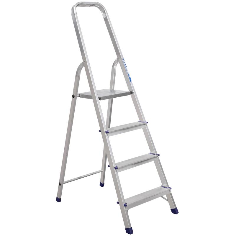 Алюминиевая стремянка АМ704 может использоваться для проведения строительных, монтажных, ремонтных и других работ. Переносная конструкция состоит из основной части со ступенями, опорной части и рабочей площадки. Дуга безопасности является продолжением стороны, по которой осуществляется подъем. Модель оснащена противоскользящими опорами из пластика и рифлеными ступенями, повышающими ее безопасность.