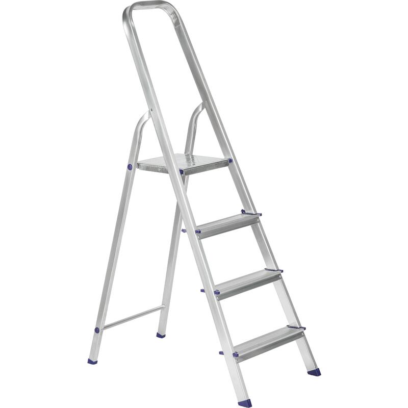 Стремянка алюминиевая 4 ступени TOPFORT. Стремянка представляет собой свободностоящую переносную лестницу, сужающуюся к верху, имеющую сторону подъема (переднюю ногу), опорную сторону (заднюю ногу), рабочую площадку и раскладывающуюся для выполнения определенной задачи. Дуга безопасности конструктивно выполнена совместно со стороной подъема.