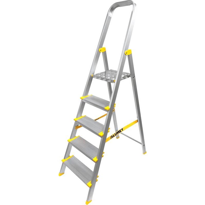 Стремянка алюминиевая 5 ступеней Алюмет (AS705). Применяется для различных работ на высоте. Конструкция из анодированного алюминия отличается высокой прочностью, небольшим весом и устойчивостью к воздействию коррозии. Широкие ступени и рабочая площадка с рифлением защищают от скольжения ноги и обеспечивают безопасность работы. Страховочные ремни надежно фиксируют стремянку на месте. Башмаки изготовлены из высокопрочного пластика. Высокая дуга безопасности служит в качестве опоры во время работы Складная конструкция не займет много места при хранении или транспортировке.