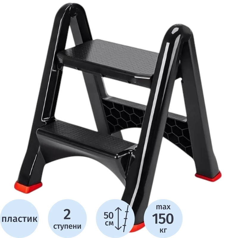 Стремянка высотой 58 см изготовлена из высококачественного пластика, который обеспечивает долговечность и прочность изделия. Этот материал не только лёгкий, но и устойчивый к воздействию окружающей среды, что позволяет использовать стремянку как в помещении, так и на открытом воздухе. Пластиковые элементы не подвержены коррозии и легко моются.