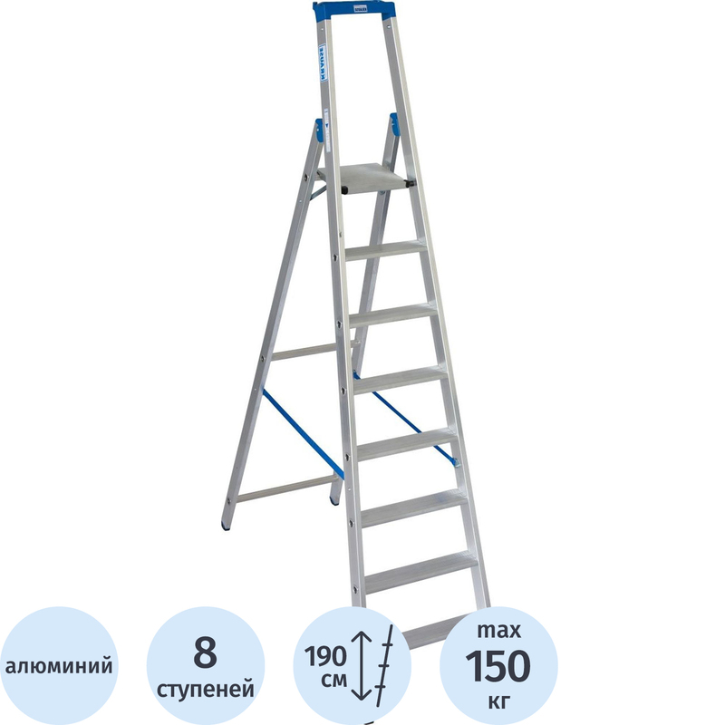 Стремянка алюминиевая 8 ступеней Krause Stabilo (124555). Прочная алюминиевая стремянка для профессионального использования. Оснащена с многофункциональной полкой и крюком для ведра.