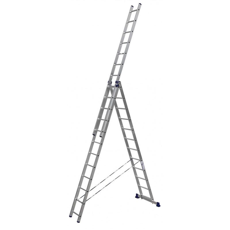 Универсальность данной лестницы 5312 заключается в том, что она может использоваться как раздвижная приставная лестница из трех частей и как свободностоящая стремянка (перевернутая русская буква «У»). Более того третья секция является съемной, и ею можно пользоваться отдельно как приставной лестницей, а оставшаяся часть при этом представляет двухсекционную универсальную лестницу. Эта лестница является по праву наиболее универсальной из всех лестниц, и несмотря на необходимый попарный перехлест секций как в конфигурации «приставная лестница» так и в конфигурации «стремянка», что усложняет, утяжеляет и поэтому удорожает ее, является самой популярной по продаваемости
