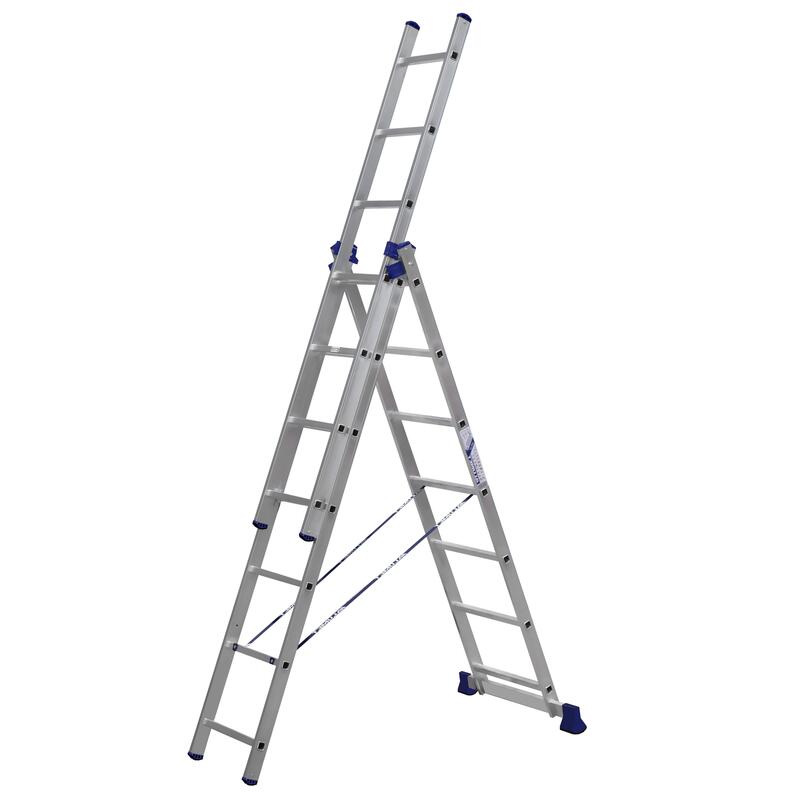 Универсальность данной лестницы 5307 заключается в том, что она может использоваться как раздвижная приставная лестница из трех частей и как свободностоящая стремянка (перевернутая русская буква «У»). Более того третья секция является съемной, и ею можно пользоваться отдельно как приставной лестницей, а оставшаяся часть при этом представляет двухсекционную универсальную лестницу. Эта лестница является по праву наиболее универсальной из всех лестниц, и несмотря на необходимый попарный перехлест секций как в конфигурации «приставная лестница» так и в конфигурации «стремянка», что усложняет, утяжеляет и поэтому удорожает ее, является самой популярной по продаваемости