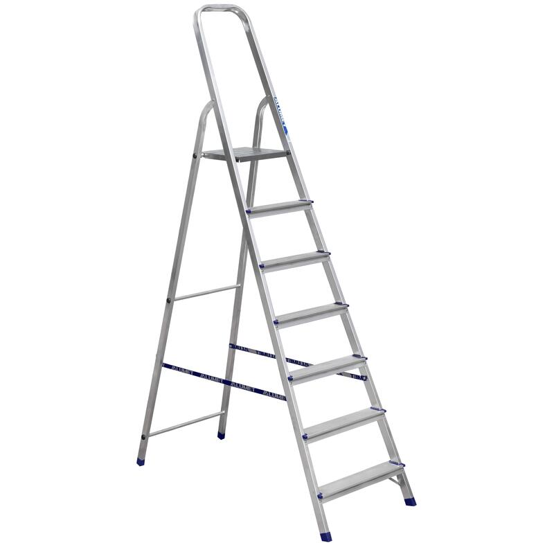 Алюминиевая стремянка АМ707 может использоваться для проведения строительных, монтажных, ремонтных и других работ на высоте до 3.5 м. Переносная конструкция состоит из основной части со ступенями, опорной части и рабочей площадки. Дуга безопасности является продолжением стороны, по которой осуществляется подъем. Модель оснащена противоскользящими опорами из пластика и рифлеными ступенями, повышающими ее безопасность. Стремянка рассчитана на эксплуатацию внутри и снаружи помещений и способна выдерживать нагрузку до 150 кг.