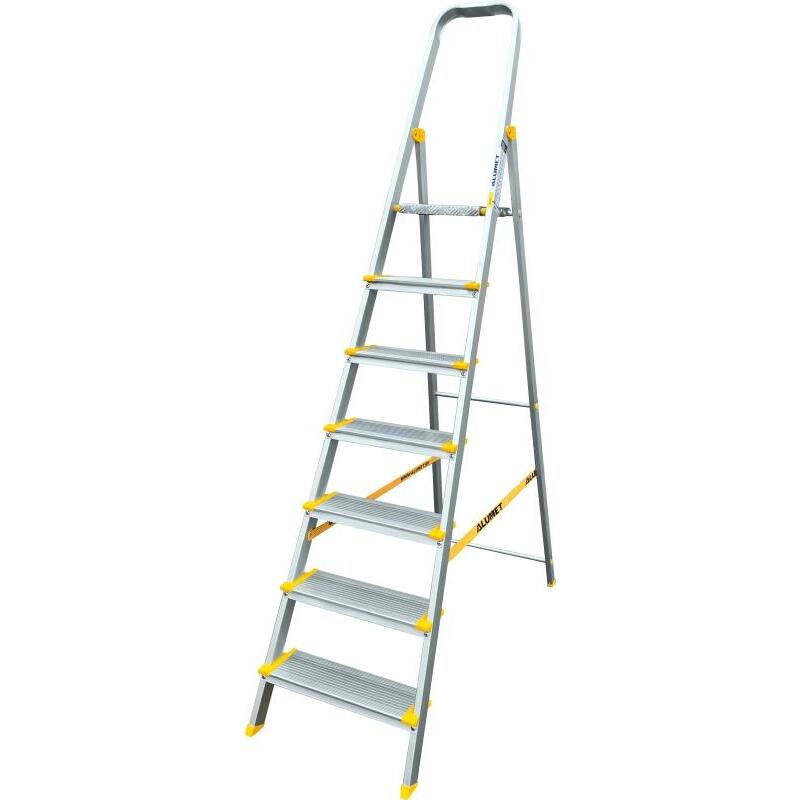 Стремянка алюминиевая 7 ступеней Алюмет (АS707). Применяется для различных работ на высоте. Конструкция из анодированного алюминия отличается высокой прочностью, небольшим весом и устойчивостью к воздействию коррозии. Широкие ступени и рабочая площадка с рифлением защищают от скольжения ноги и обеспечивают безопасность работы. Страховочные ремни надежно фиксируют стремянку на месте. Башмаки изготовлены из высокопрочного пластика. Высокая дуга безопасности служит в качестве опоры во время работы Складная конструкция не займет много места при хранении или транспортировке.