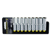 6-гранных SuperLock ½" 9 предметов BERGER. 9шт.- головка торцевая6-гранная удлиненная Superlock ½«: 8,10,11,12,13,14,15,16,17 мм. Выполнен из прочной и качественнойхром-ванадиевой стали (CR-V ). Упаковка — пластиковый держатель.