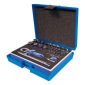 Набор шестигранных торцевых головок с принадлежностями King Tony 1/4″ 4-14 мм 29 предметов 2528MRV имеет несколько видов головок в комплекте, что делает набор универсальным. Ложемент из этиленвинилацетата (ЭВА) отличается устойчивостью к деформации и растворителям и оптимально подходит для размещения на инструментальной тележке. Кейс защищает комплект от ударов при транспортировке.