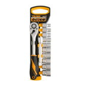 Торцевые головки и принадлежности для работы с ними изготовлены из прочной стали CrV; Поверхности имеют хромированное покрытие; Двухкомпонентная рукоятка трещотки GRIPro обеспечивает надежный хват и удобство при работе; Набор инструментов поставляется на пластиковом держателе с возможностью подвеса на рабочем месте.