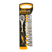 Торцевые головки и принадлежности для работы с ними изготовлены из прочной стали CrV; Поверхности имеют хромированное покрытие; Двухкомпонентная рукоятка трещотки GRIPro обеспечивает надежный хват и удобство при работе; Набор инструментов поставляется на пластиковом держателе с возможностью подвеса на рабочем месте.